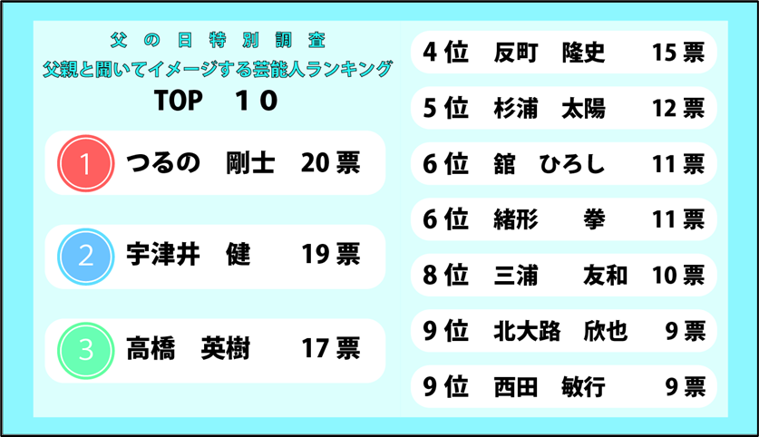 父の日についてアンケート結果発表の前に452名が選ぶ、「父親」と聞いてイメージする芸能人ついて大調査をしました!!