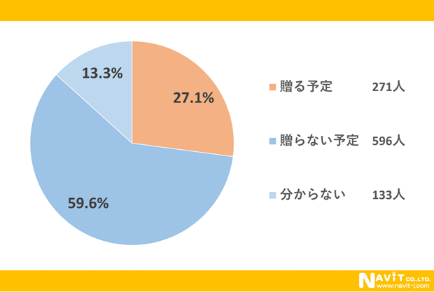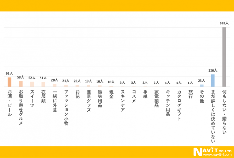 今年の父の日にプレゼントを送りますか?というアンケートに対して「送る予定」と回答された人は27.1%に留まりました。過去にナビットが行った「母親と聞いてイメージする芸能人は誰?!母の日について大調査!【1000人アンケート】」では、約4割の人が「送る」と回答しています。家庭内での優先順位を見るようで、切ないですね。