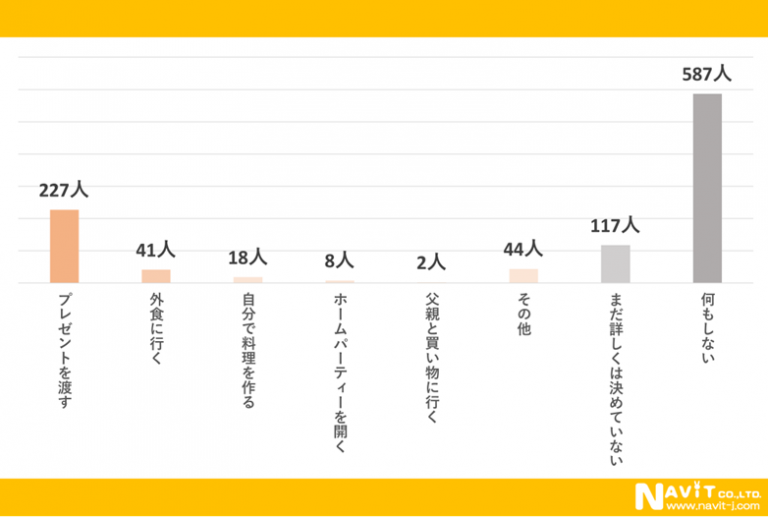 このアンケートは複数回答でいただきました。1番多い回答は「プレゼントを渡す」で227人です。次に多かったのは、「外食に行く」で41人、「自分で料理をする」が18人と続いています。