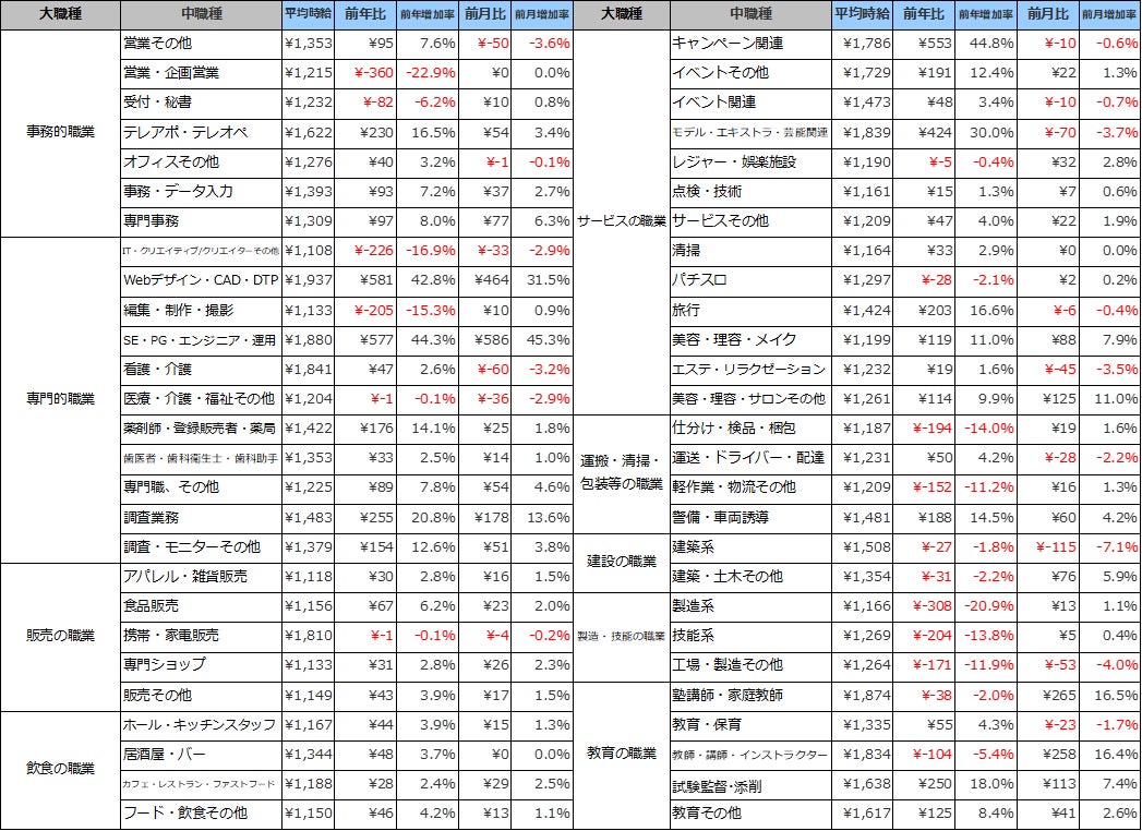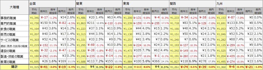 関東エリアの平均時給は1,391円(前年比4円増、前月比22円減)、東海エリアの平均時給は1,208円(前年比113円減、前月比4円増)、関西エリアの平均時給は1,261円(前年比74円減、前月39円減)、九州エリアの平均時給は1,360円(前年比6円減、前月比21円減)となりました。