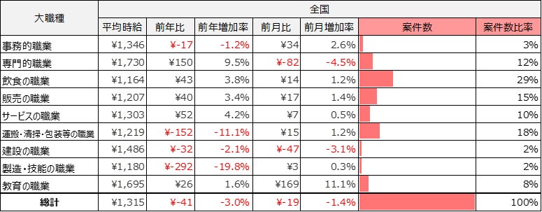 事務的職業は1,346円(前年17円減、前月比34円増)、専門的職業は1,730円(前年比150円増、前月比82円減)、飲食の職業は1,164円(前年比43円増、前月比14円増)、販売の職業は1,207円(前年比40増、前月比17円増)、サービスの職業は1,303円(前年比52円増、前月比7円増)、運搬・清掃・包装等の職業は1,219円(前年比152円減、前月比15円増)、建設の職業は1,486円(前年比32円減、前月比47円減)、製造・技能の職業は1,180円(前年比292円減、前月比3円増)、教育の職業は1,695円(前年比26円増、前月比169円増)となりました。