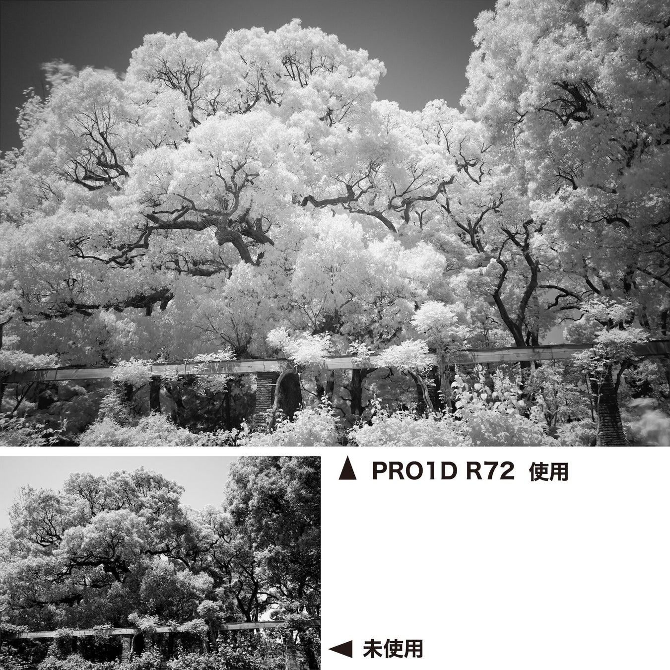 R72を使用することで、肉眼と異なる明暗の赤外線写真を楽しむことができます。赤外撮影では露出の調整が大変難しいものですが、デジタルカメラなら撮影画像を確認して露出を調節し、その場での再撮影が可能です。カメラのメーカーや機種により、赤外の感光特性が異なるため、露出の調整など、実際に撮りながらコツをつかむ必要はありますが、より多くの方に赤外線写真を楽しんでいただけるフィルターです。