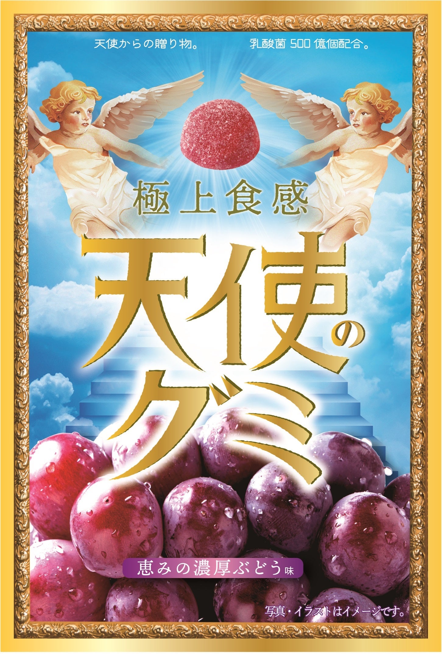 天使からの贈り物をテーマに極上食感にこだわり、ぶどうのジュレを最大限まで入れたジューシーやわらかグミ。