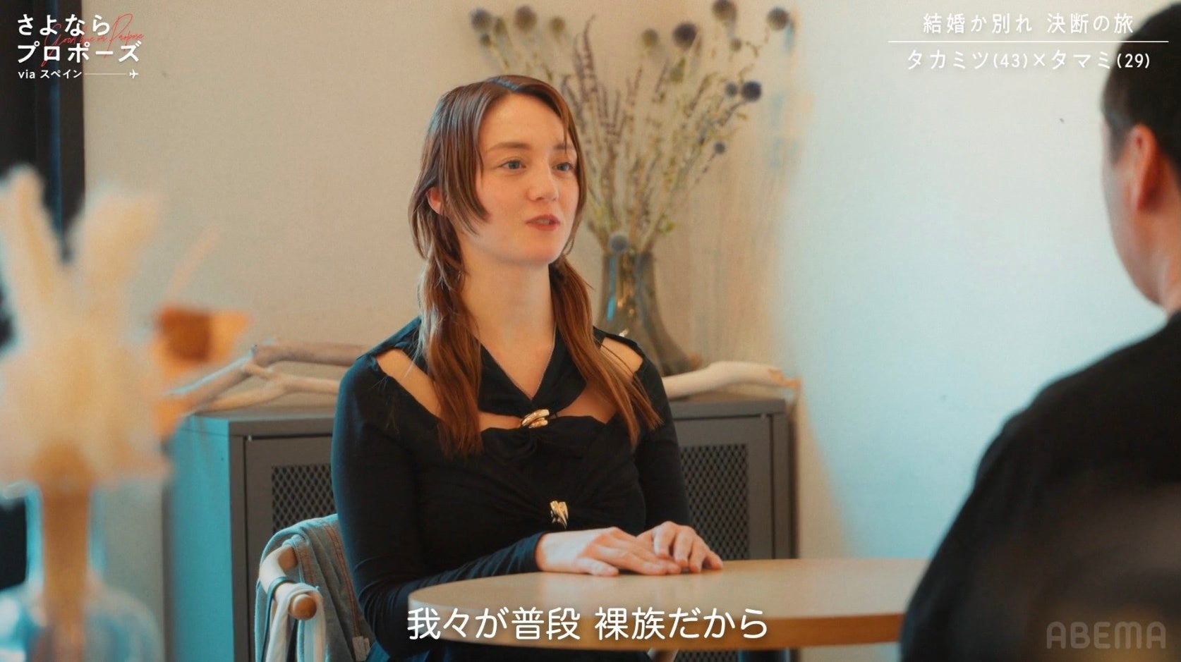 今回は、そんな2人の特殊な私生活が明らかに。スペイン出発前に9歳上の実兄と会っていたタマミは、タカミツとの結婚について相談。兄は「タマミの家を訪れた際、タカミツが押し入れに隠れていた」と懐古すると、タマミは「裸だったからね」「お互いふだん裸族だから」とあっさり語り、兄を驚かせました。