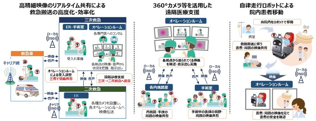 ※これらテーマに加えて、技術実証として、「分散アンテナシステム」及び「中継器」(リピーター)を用いた病院における柔軟な効率的なエリア構築を行い、医療分野におけるローカル5Gの社会実装ユースケースの確立を目指します。