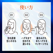 泡を舌に直のせし、10秒ほどクシュクシュしてハグキまで行き渡らせた後に、歯をみがき、ハグキマッサージをしてください。