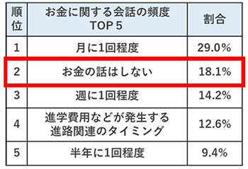 <保護者>高校生の子どもとお金の話をする頻度 1位“月1回程度”、2位“しない”