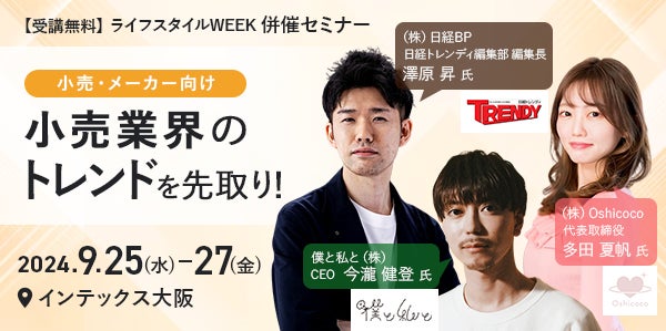 RX Japan株式会社(本社:東京都中央区、代表取締役社⻑:⽥中 岳志)は、2024年9⽉25⽇(水)〜27⽇(金)の3⽇間、インテックス大阪にて小売「ライフスタイルWeek関西」を開催します。
