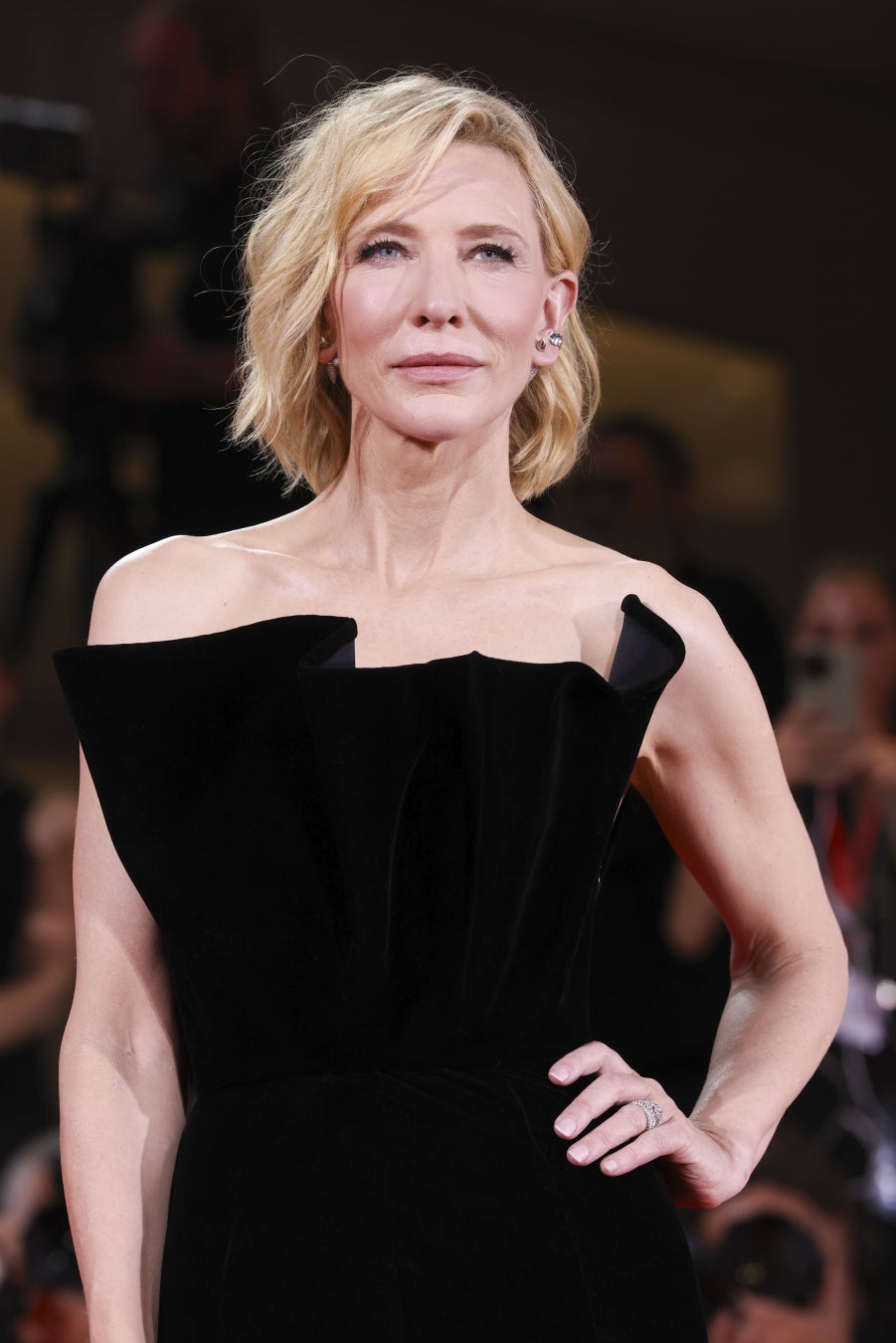 ケイト·ブランシェットは、ブラックのベルベットのシェル型の折り紙ビスチェドレスに、ブラックのベルベットのパンプスを合わせました。