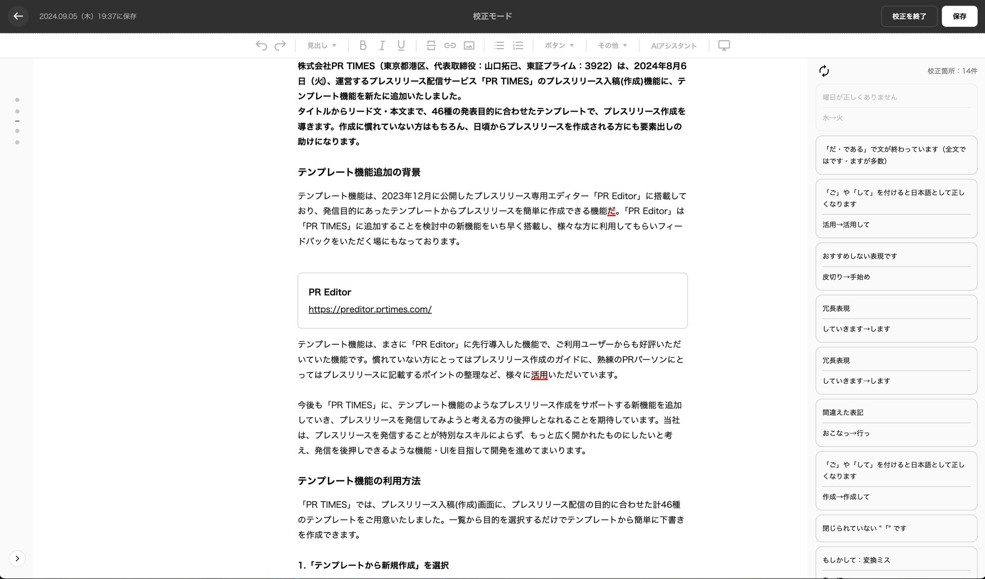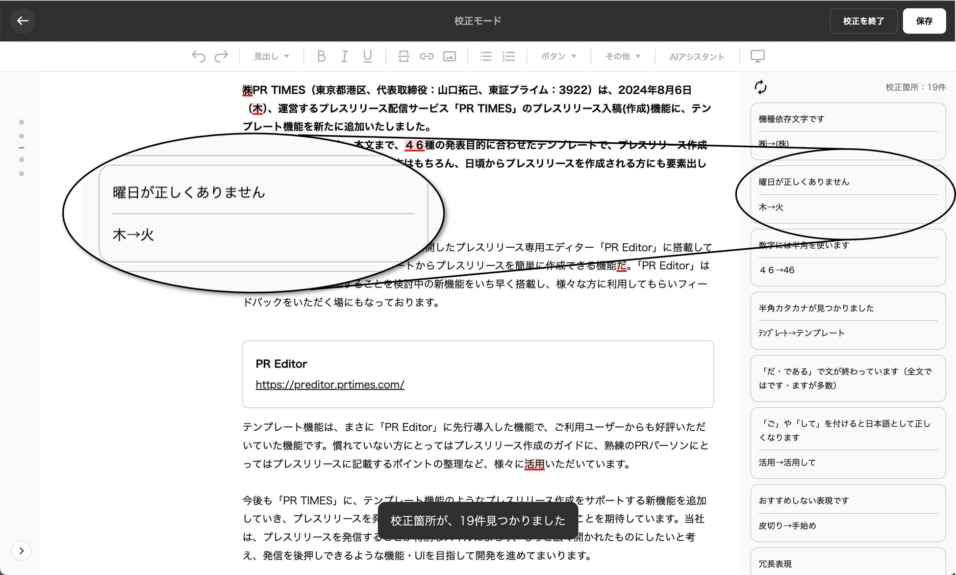 これまで搭載していた校正機能と比べ、UI(ユーザーインターフェイス)を大幅に使いやすくした上、曜日の間違いや語尾の統一などのプレスリリースの文章を整えることに特化した校正機能となっています。