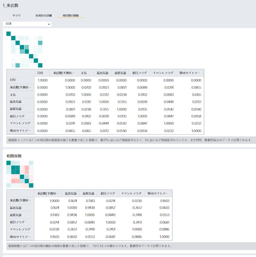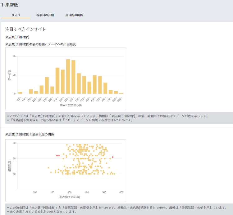 AI予測分析のはじめのステップである「学習」のフェーズにおいて、ユーザーがインポートした学習データから読み取れる内容を、グラフ等で可視化して表示する機能です。データにどのような値がどれくらい入っているのかを知ることができ、データの傾向を掴むことができます。