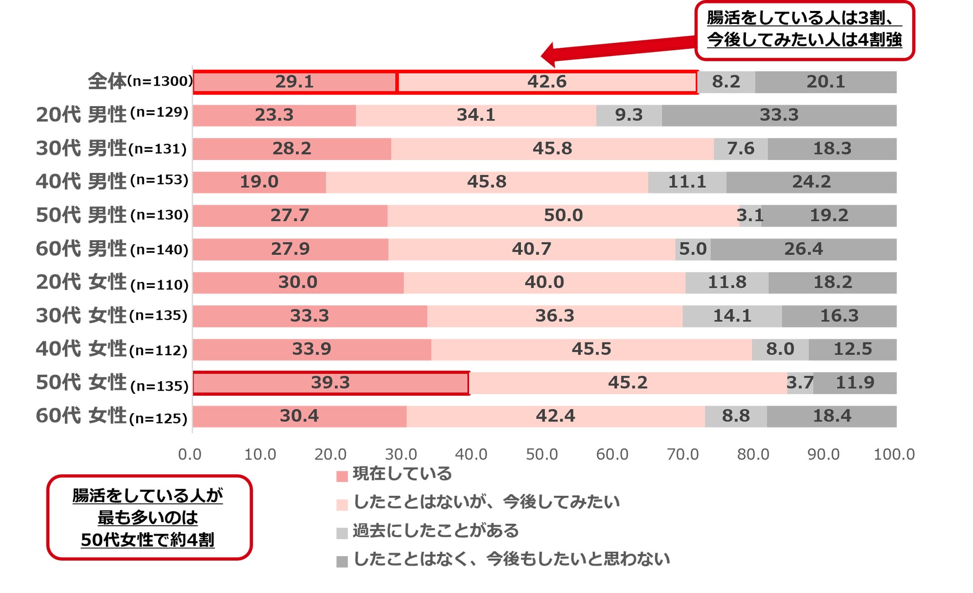 ①現在腸活をしている人は3割で、したことはないが今後してみたい人は4割強。腸活をしている人が最も多いのは50代女性で4割。