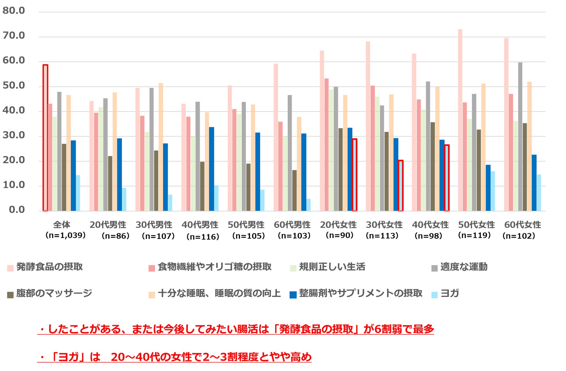 ②したことがある、または今後してみたい腸活は、「発酵食品の摂取」が6割弱で最多。以下「適度な運動」「十分な睡眠、睡眠の質の向上」「食物繊維やオリゴ糖の摂取」が4割台で上位。「ヨガ」は20~40代の女性で2~3割程度とやや高め。