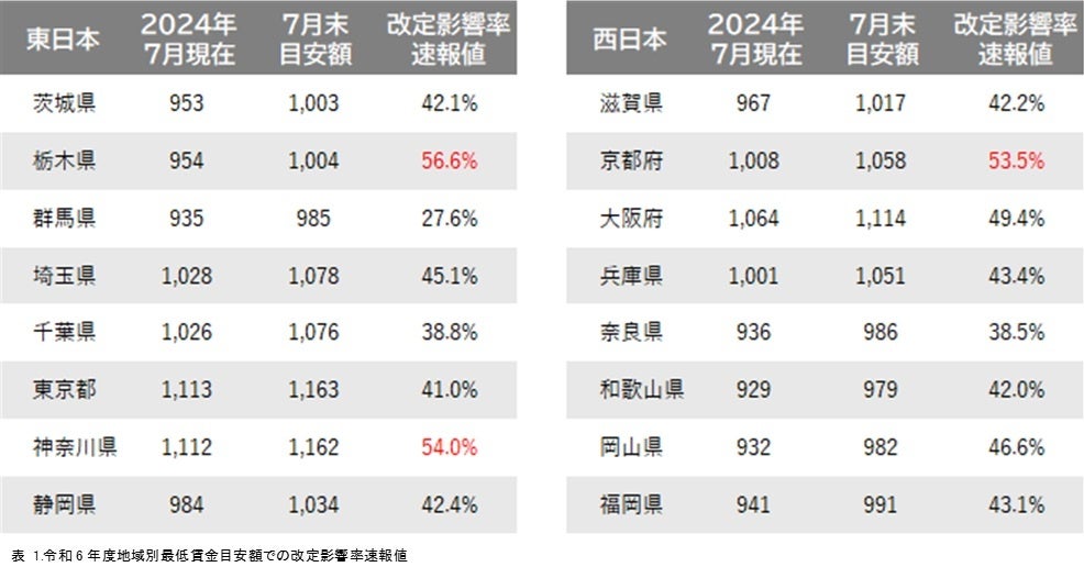 東日本の集計地域では、改定影響率速報値が最も高い地域は「栃木県」の56.6%、次いで「神奈川県」の54.0%、「埼玉県」の45.1%となった。今年度の改定で地域別最低賃金が初めて1,000円を超える見込みとなっている「茨城県」「栃木県」「静岡県」では、いずれも改定影響率速報値が4割を上回った。