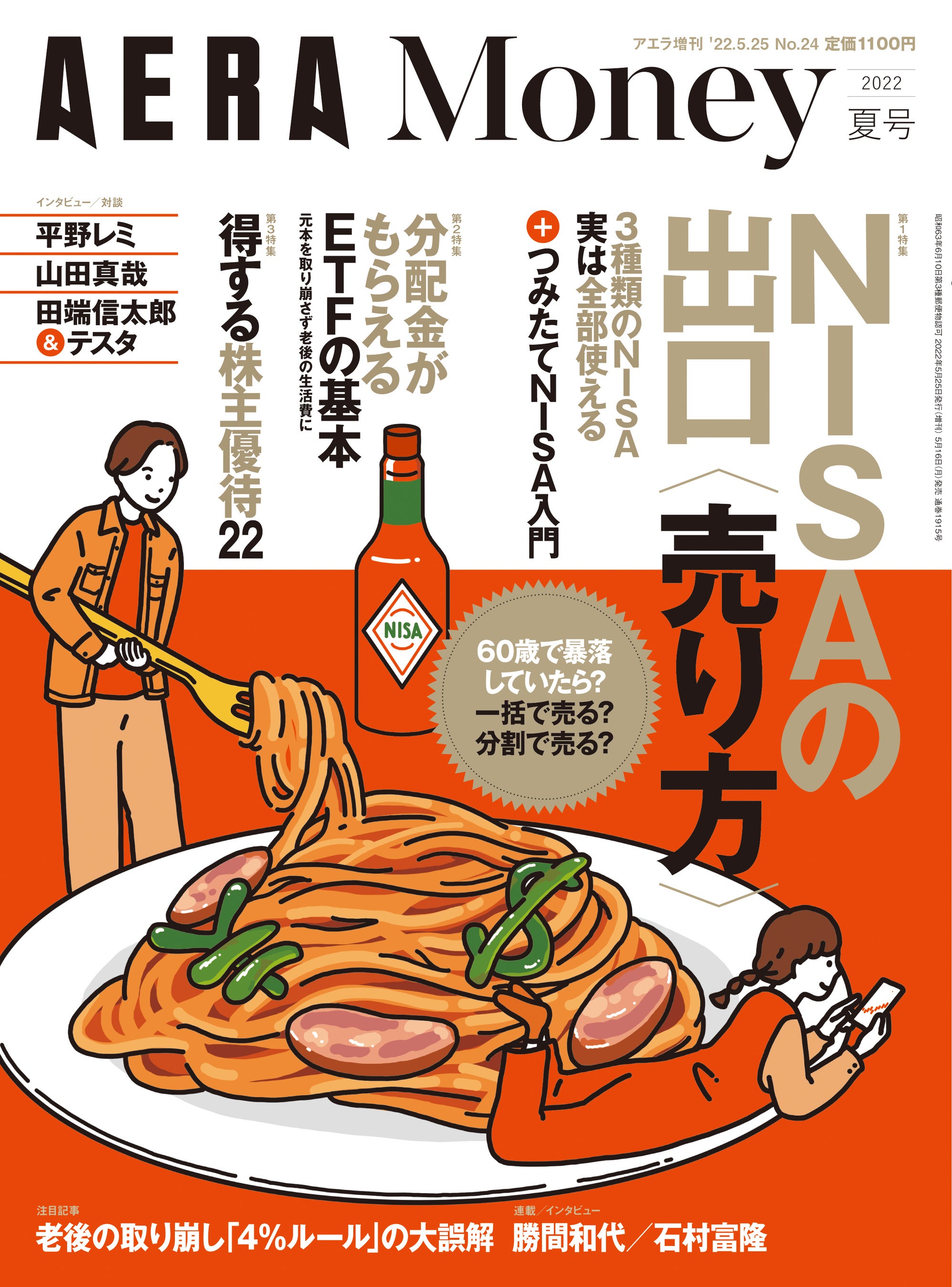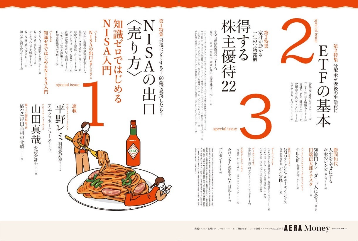 大好評「AERA Money」の「夏」最新号『AERA Money 2022夏号 「NISAの出口〈売り方〉」』(アエラ増刊)が2022年5月16日(月)発売になりました! 3大特集は「NISAの出口〈60歳以降の売り方〉」「ETFの基本〈分配金で老後の生活費がラクになる〉」「はじめての株主優待」。巻頭インタビューには料理愛好家の平野レミさん、公認会計士(オタク会計士)の山田真哉さんが登場。特別対談に田端信太郎さん×テスタさん!