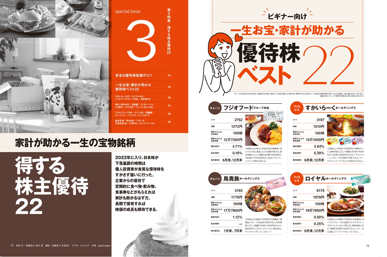 株価の値上がりだけを期待せず、長期保有で配当ももらいながら年に1~2度、おいしいものが送られてくるのが株主優待。「気長に持つなら超優良企業がいいよね!」ということで、名だたる有名22社がAERA Moneyに協力、優待の実物写真を提供してくれました。