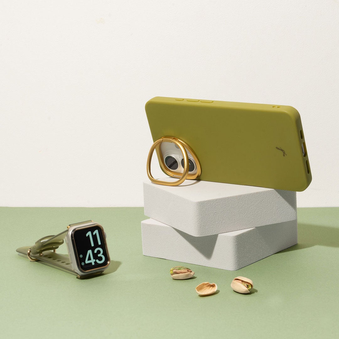 ゴールドパーツで接地を防ぎ、スマホを守ります。