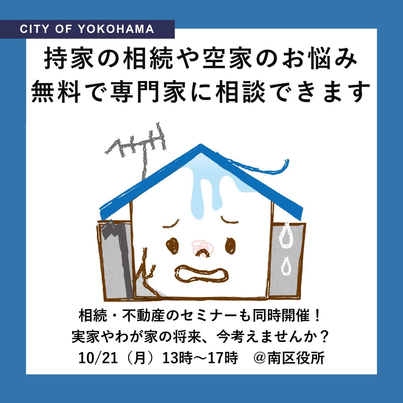 横浜市が主催する空家無料相談会を令和6年10月21日(月)13:00~17:00、南区役所で開催します。横浜市と「空家等対策に関する協定」を締結している、不動産、法務、建築などの専⾨家団体の相談員によるセミナーと個別相談会の同時開催です。