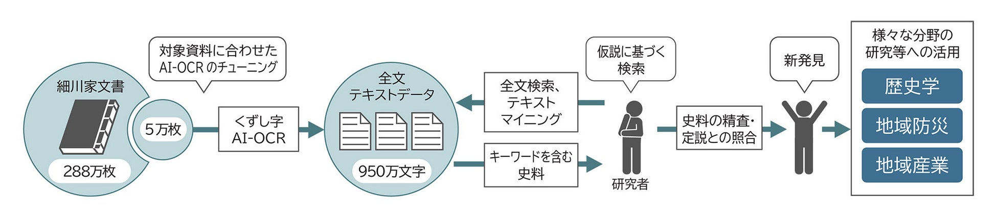 永青文庫所蔵の『細川家文書』における未解読の古文書約5万枚を、くずし字AI-OCRを用い短期間で全文テキスト化に成功。