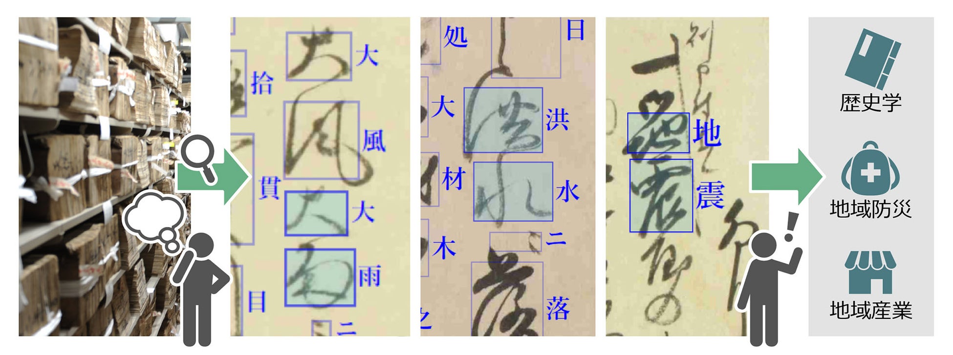 世界史上の「近世」と呼ばれる時代において、日本ほど多くの文書が作成された地域は他にないといわれます。しかしこれまでは、独特の草書体で書かれた大量の近世文書から情報(キーワード)を引き出すには、それらを人力で解読して文字データ化する必要があり、必然的に膨大な時間を必要とするため、処理可能なデータ量が限られて、研究推進の大きな壁になっていました。