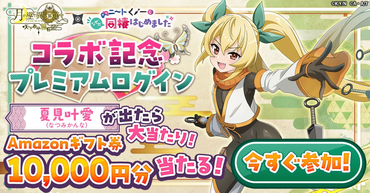 CTW株式会社は、G123で配信中のHTML5ゲーム『月が導く異世界道中 天下泰平旅日記(ツキミチ旅日記)』にて、現在放送中のTVアニメ『ニートくノ一となぜか同棲はじめました』とのコラボイベントを本日より開催いたします。