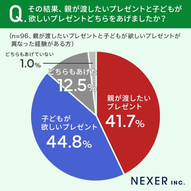 また、親が渡したいプレゼントと子どもが欲しいプレゼント、どちらを渡すかはほぼ半数に分かれるという結果になりました。