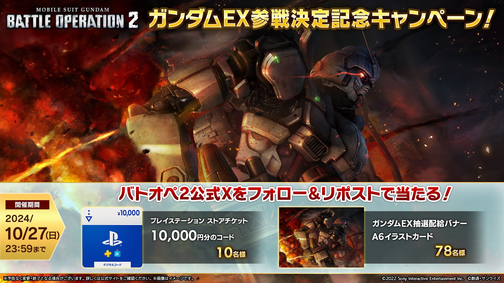 『バトオペ2』に「ガンダムEX」の実装が決定したことを記念して、プレイステーション ストアチケットや「ガンダムEX」抽選配給バナーA6イラストカードが当たるフォロー&リポストキャンペーンを実施中です。