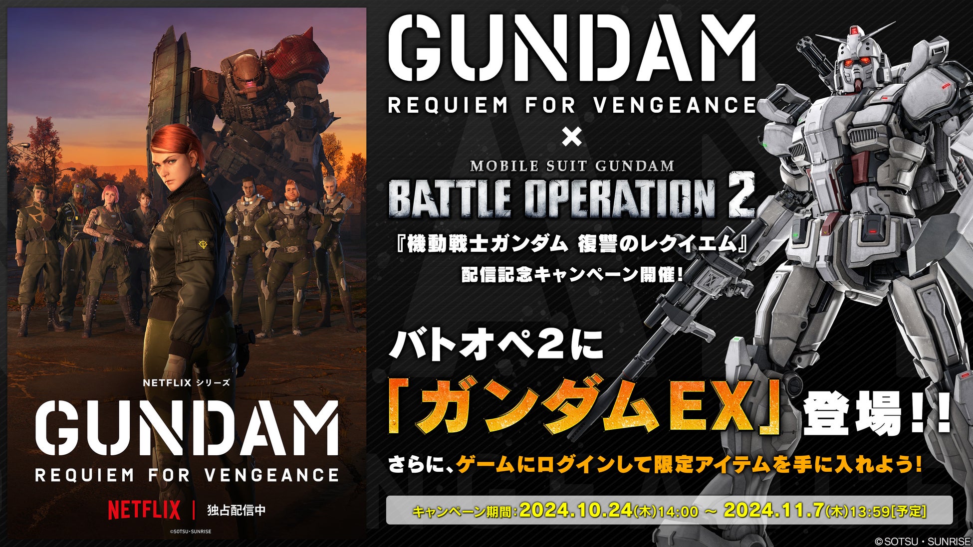 株式会社バンダイナムコエンターテインメントは、PlayStation®5/PlayStation®4向けオンライン専用ゲーム『機動戦士ガンダム バトルオペレーション2』(以下、『バトオペ2』)は、『機動戦士ガンダム 復讐のレクイエム』がNetflixにて10月17日(木)より配信開始されたことを記念して、本日10月24日(木)より『復讐のレクイエム』配信記念キャンペーンを開催したことをお知らせいたします。