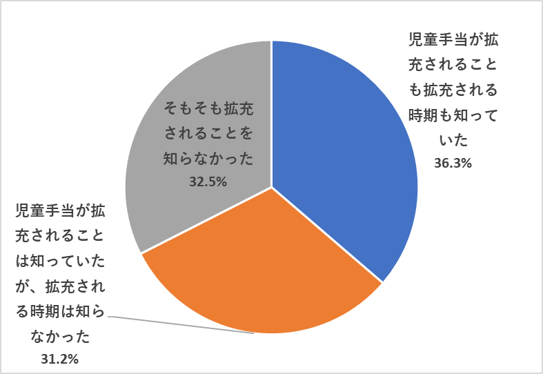 児童手当が拡充されることを知らなかった方が全体の3割も占めていました。また、拡充自体は知っていても時期はわからない方も3割ほどいました。
