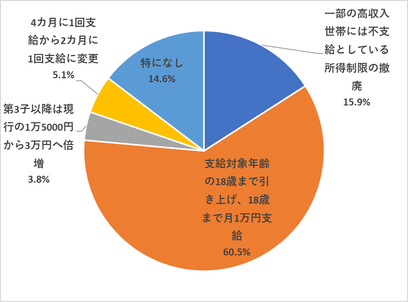 対象児童が18歳まで引き上げられることに魅力を感じている方が6割ほど占めています。その他、「所得制限撤廃」が16%、「支給時期の変更」が5%を占めています。