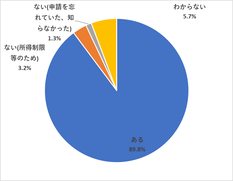 申請したことがある方は全体の9割を占めています。一方、「申請を忘れた、または知らなかった」、「わからない」という方が7%いました。