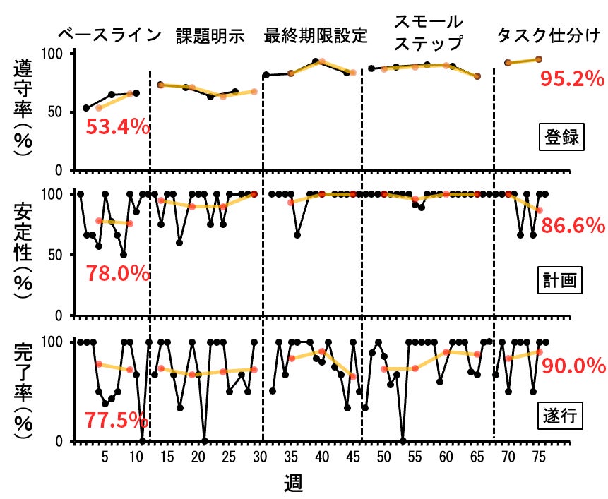 下図は各指標の週次数値(黒線)と月次数値(橙色)の具体的な推移を示します。縦線部分が介入の実施ポイントであり、介入により、変化が顕著に確認できます。介入内容の詳細については、論文をご確認ください。