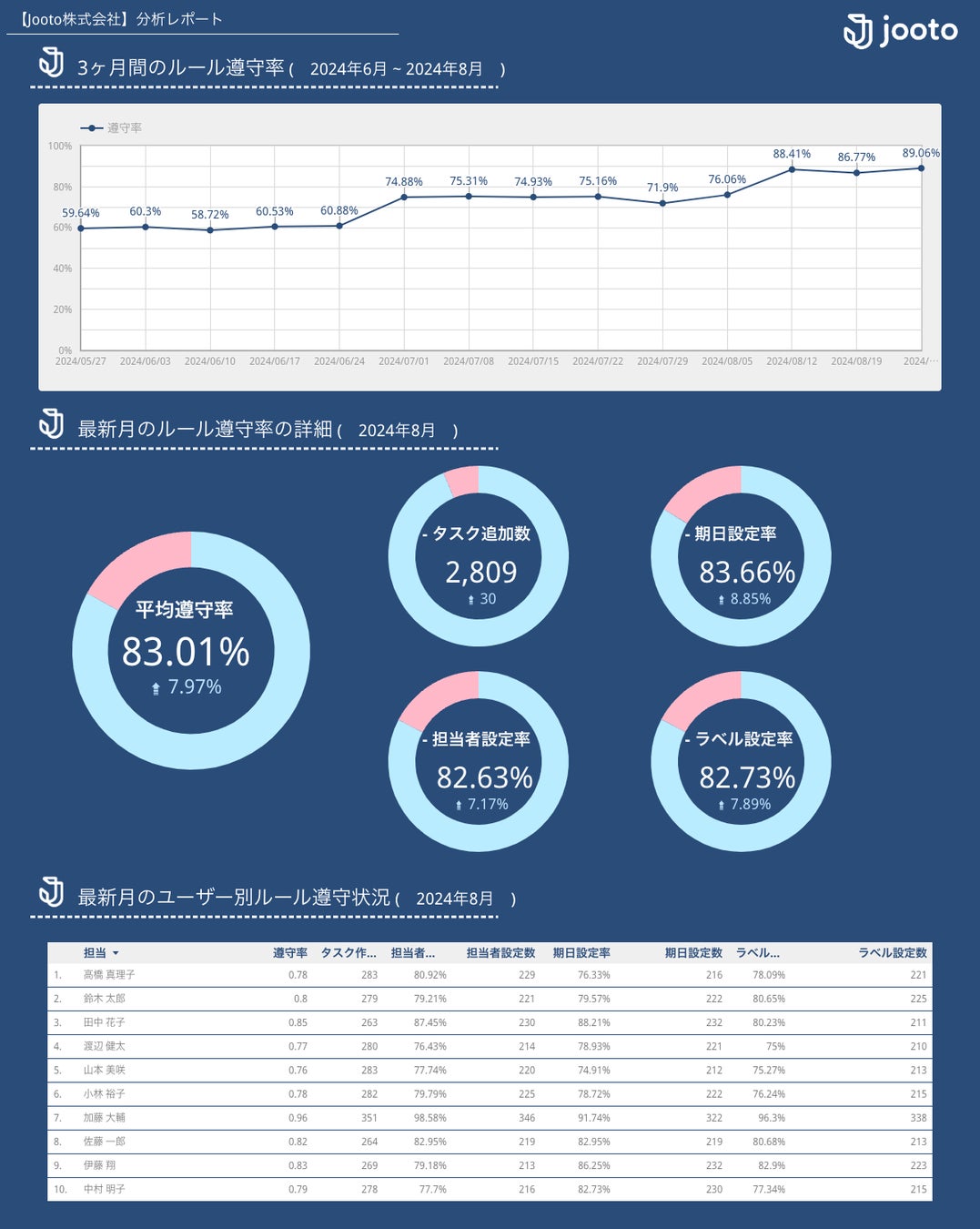 今回の研究結果をJootoのお客様にもお役立ていただこうと、有効性が判明した3つの指標「遵守率」「安定率」「完了率」を計測しレポートで提供する「分析レポートサービス」の提供を2024年9月18日(水)より開始いたしました。3つの指標によって自社の課題を明確にし、改善の打ち手を考え、効果を確認することができるようになります。また、導入支援においても、専任担当が本レポートを活用したルール作成や業務改善提案の実施を行うことが可能になりました。詳細は以下よりお問い合わせください。