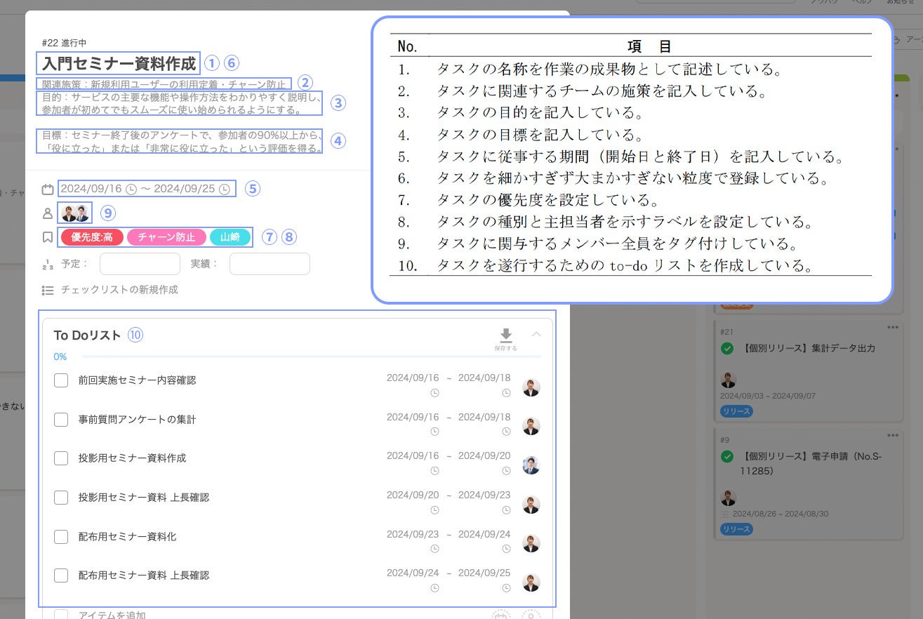 タスク登録時の入力項目に関するルールを作成し、守られていた項目数の割合を"遵守率"として算出します。業務管理では、タスクを正確に記載し、チーム全員で共有することが重要です。特に、1タスクを「プレゼン準備(広義)」にするのか「資料作成(狭義)」にするのかといったタスクの粒度を揃えることで、チーム内で進捗状況を一貫して把握できるようになります。タスク登録ルールの遵守率が向上すると、統一された形式でツール内に記載されるため、メンバー間の理解がスムーズになり優先順位が明確化されます。