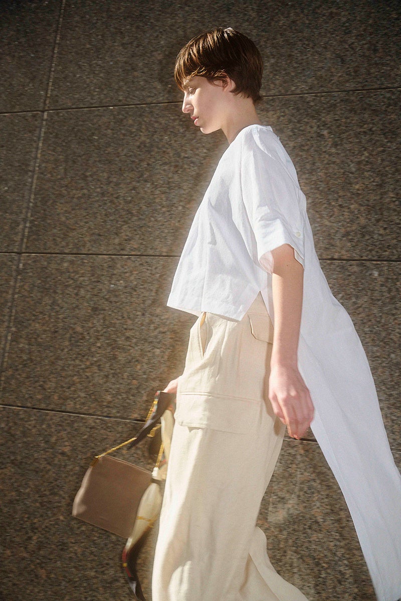 3月14日(金)より公開するVol.2では、リネンシルクのシャンブレー素材を使ったリラックスフィットジャケットとバレルシルエットパンツ、スプリングツィードを使ったケープジャケットとペンシルスカートなどセットアップのバリエーション、イタリア高級シャツ地メーカーALBINI(アルビニ)社の素材を使ったバックテールが印象的なプルオーバートップ、同じくイタリアの老舗テキスタイルメーカーFaliero Sarti社のコットンシルクチェックで仕立てたシアーシャツ、透明感のある軽やかなオーガンザにインドのVENTURES社のラグジュアリー刺繍を施したフレアスカートなど軽やかでエアリーなアイテムが揃います。また、ラスティックなリネンの質感がシンプルなシルエットを引き立てるコクーンサックドレスやコットン、リネンのタイプライター素材をたっぷりとしたギャザーでエレガントに仕上げたローウェストドレスなど夏を彩るサマードレスも必見です。