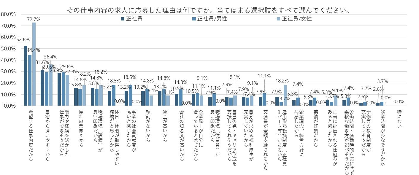 一方、「女性」のほうが「男性」よりも「希望する仕事内容だから」が28.3pt、「雇用形態転換制度(正社員⇔パート等)があるから」が14.5pt、「自宅から通いやすいから」が6.8pt高くなった。仕事内容を重要視して応募企業を検討している人が7割に上ることがわかった。