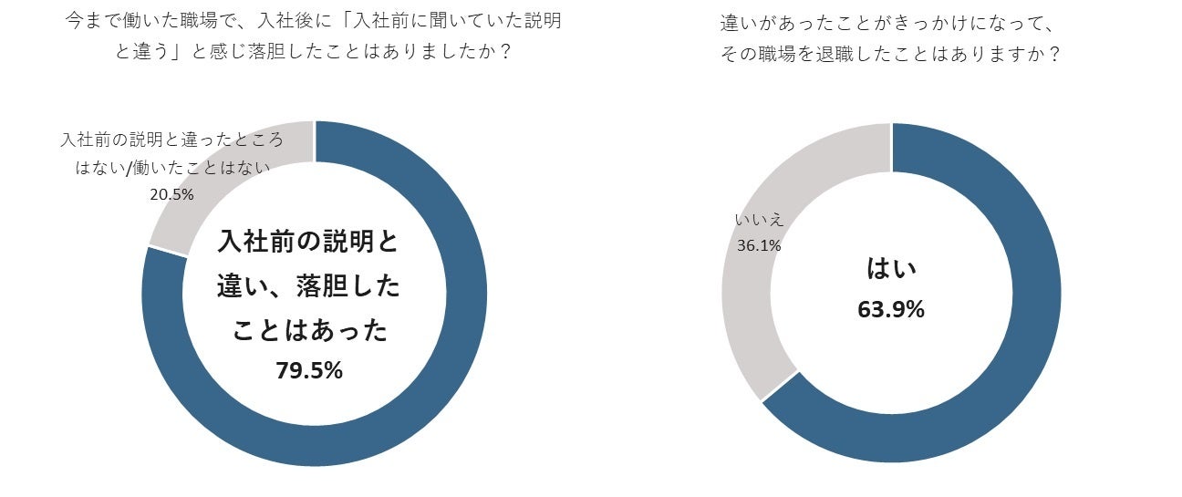 約8割の人が「入社前に聞いていた説明と違う」ことに落胆した経験あり。そのうち63.9%が退職のきっかけに