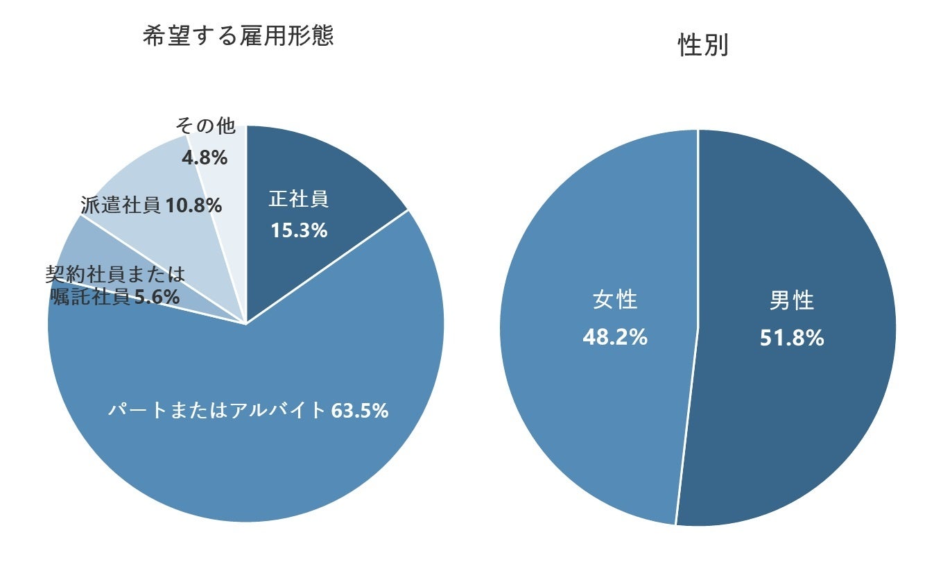 一方、「女性」のほうが「男性」よりも「扶養の範囲内で働けるから」が15.8pt、「賃金が高いから」が11.0pt、「すぐに働き始められそうだから」が9.8pt高くなった。限られた時間の中で、効率的に収入が得られる形が選ばれている。
