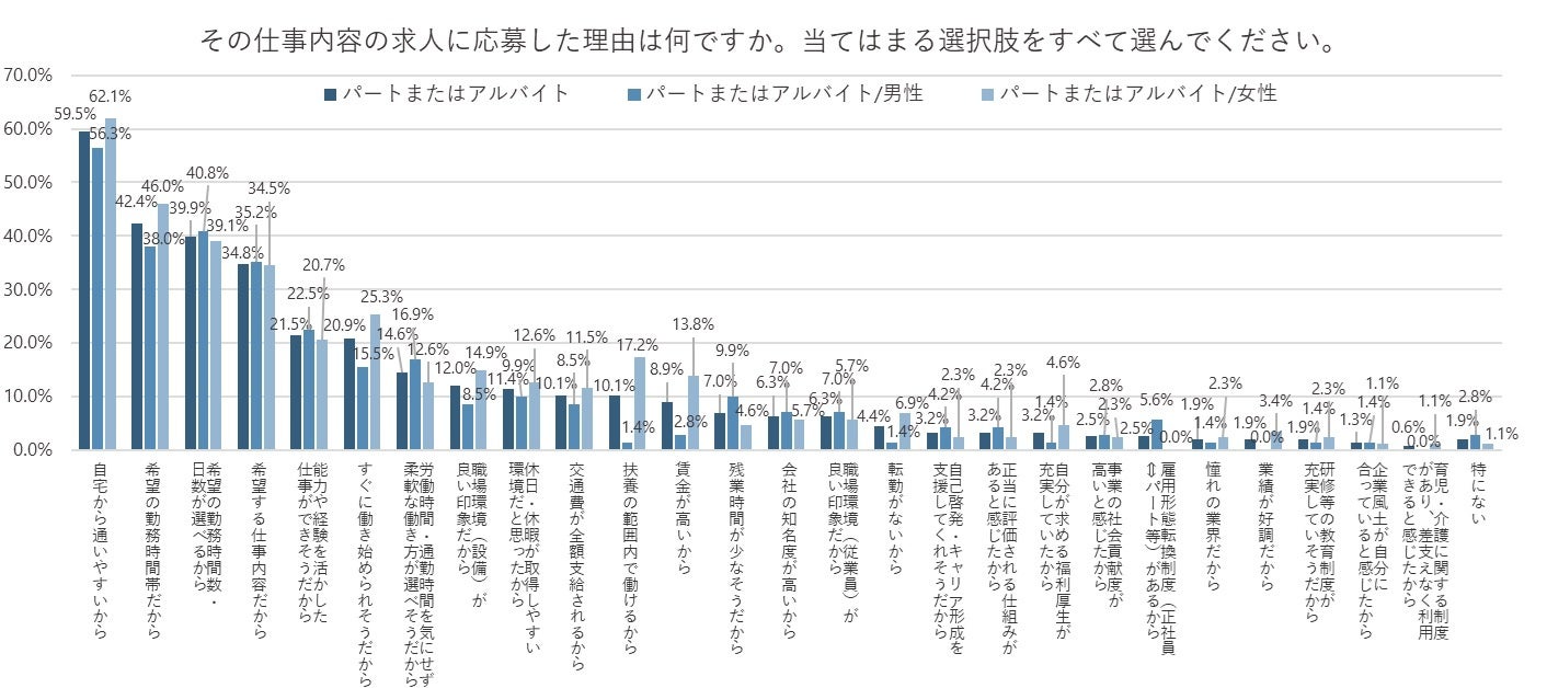 「自宅から通いやすいから」59.5%、「希望の勤務時間帯だから」42.4% 、「希望の勤務時間数・日数が選べるから」39.9%