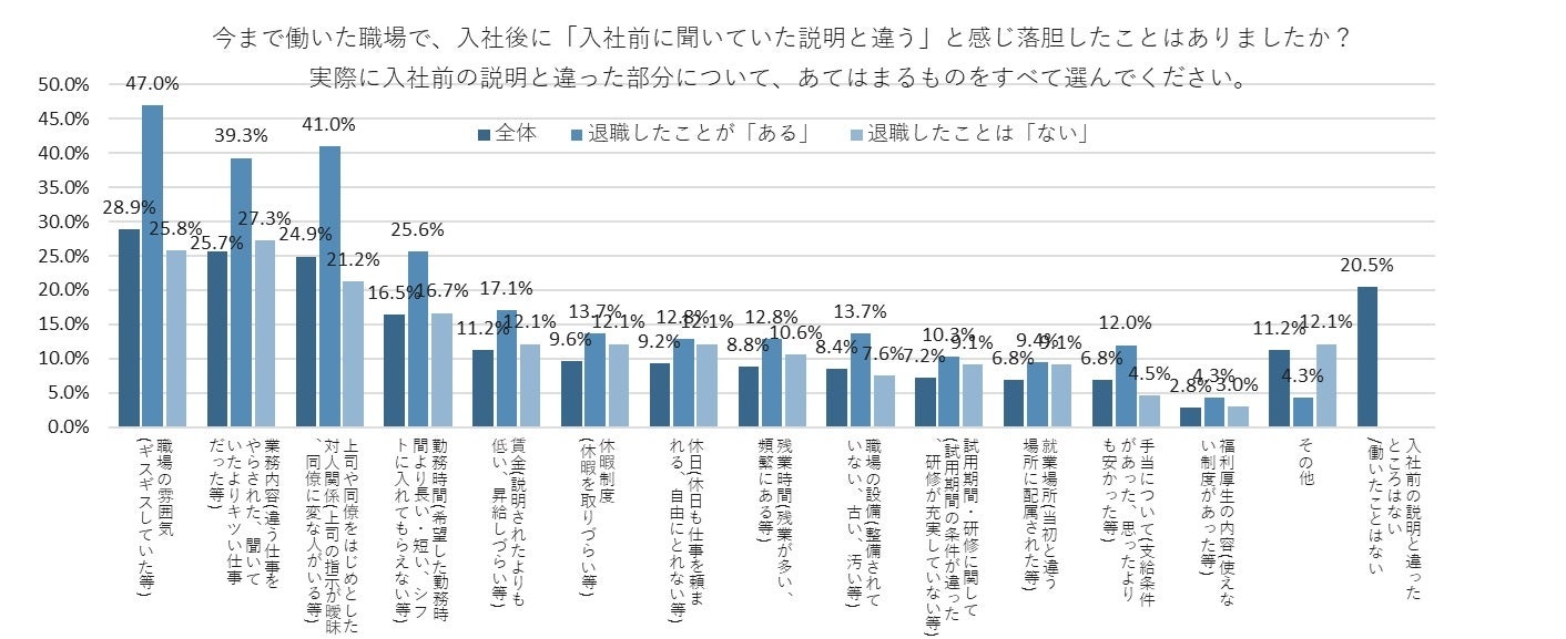 「入社前に聞いていた説明と違う」と感じ落胆したかどうかの設問では、具体的にどんな内容に違いを感じたのかをきいている。違いを感じた内容で最も多かったのは「職場の雰囲気」で28.9%、次いで「業務内容」で25.7%、「上司や同僚をはじめとした対人関係」が24.9%となった。業務内容は仕事の選び方でも上位になりやすく、その分事前の確認と異なった場合落胆につながりやすいのかもしれない。また、雰囲気や対人関係は仕事の選び方の上位にはあまり入ってこないが、ギャップを感じた場合落胆につながりやすいようだ。