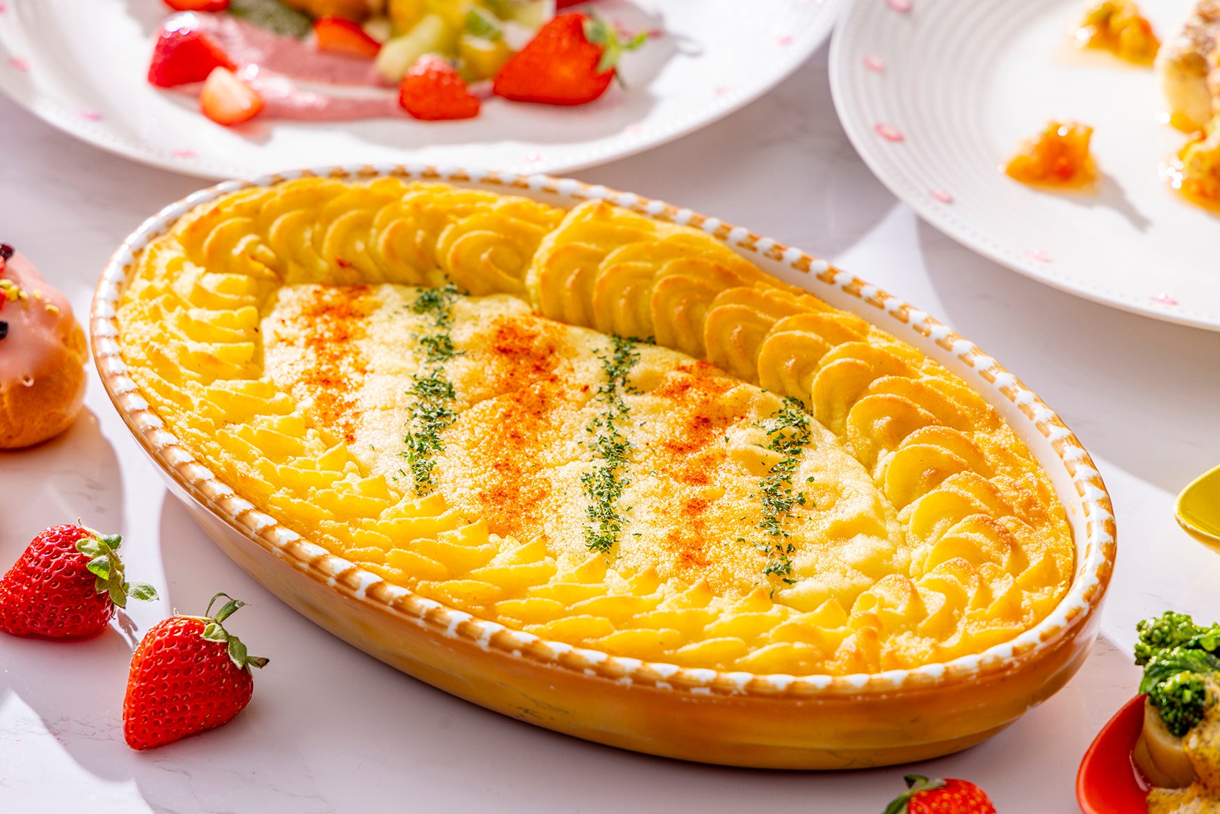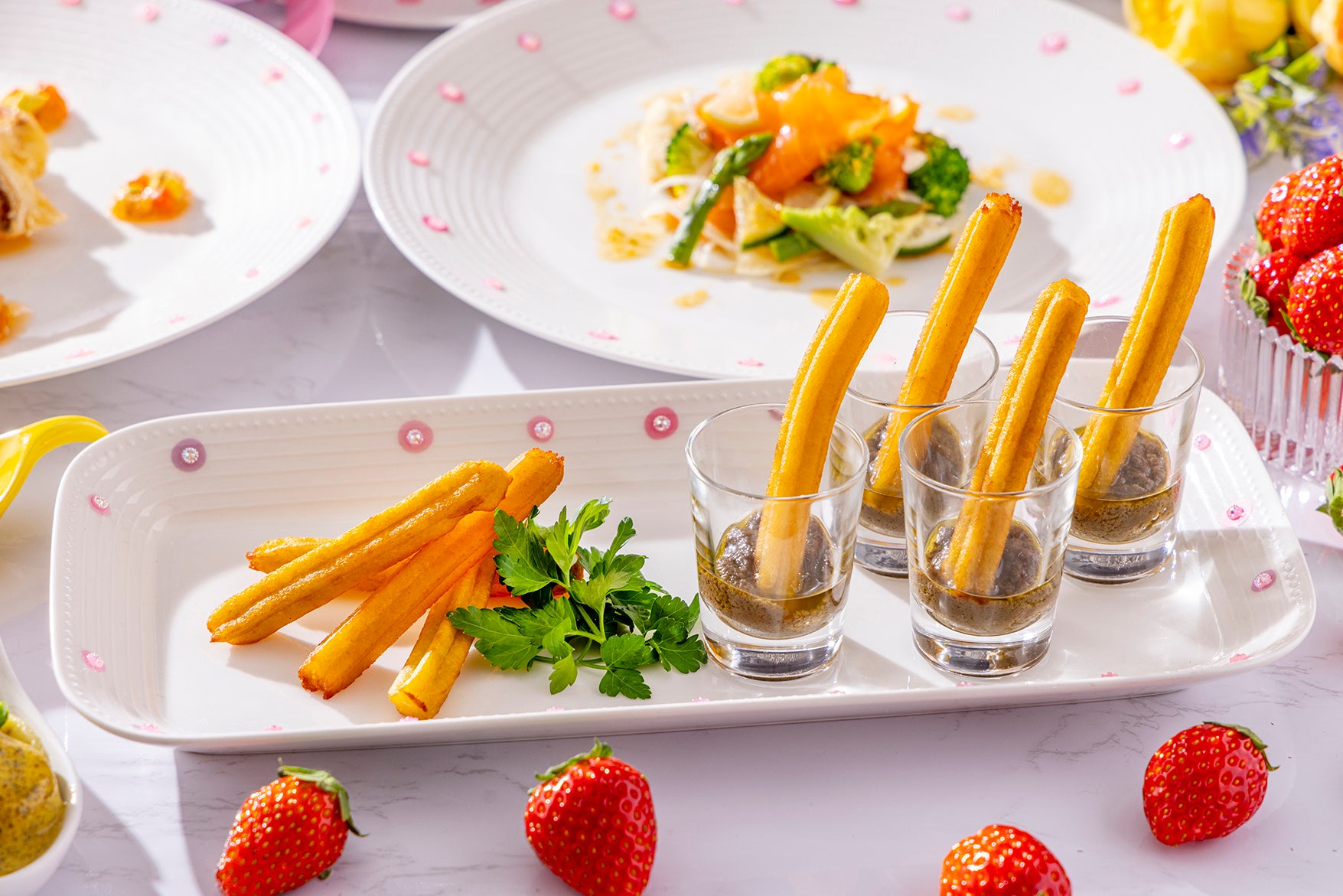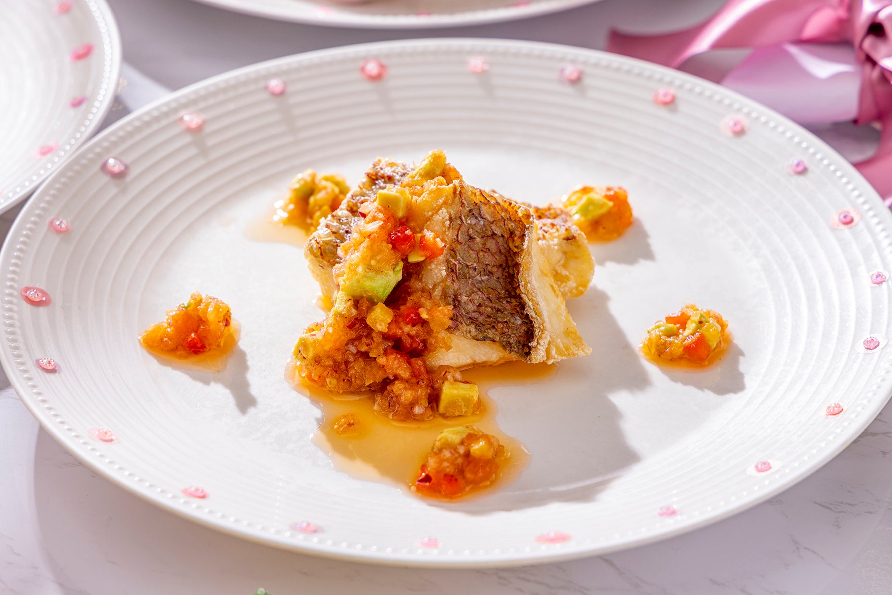 1st Seasonに引き続き、デザートはストロベリーをメインにキューブ型のショートケーキや様々なベリーをたっぷりトッピングしたクグロフ、ドーム型の表面にスライスしたストロベリーを隙間なく並べた見た目もかわいらしいベリードームショコラなど数多くのメニューをご用意しました。さらにランチではやわらかい食感と甘さがつまった、大粒の「くろいちご」のグラスサービス、ディナーではフレッシュ苺の食べ放題もご用意しています。お料理は菜の花、春キャベツ、新玉ねぎ、蕗の薹を使い、春を感じるメニューがラインアップ。春色パステルカラーのソースをかけて五感で楽しむ、春フレンチをお楽しみください。