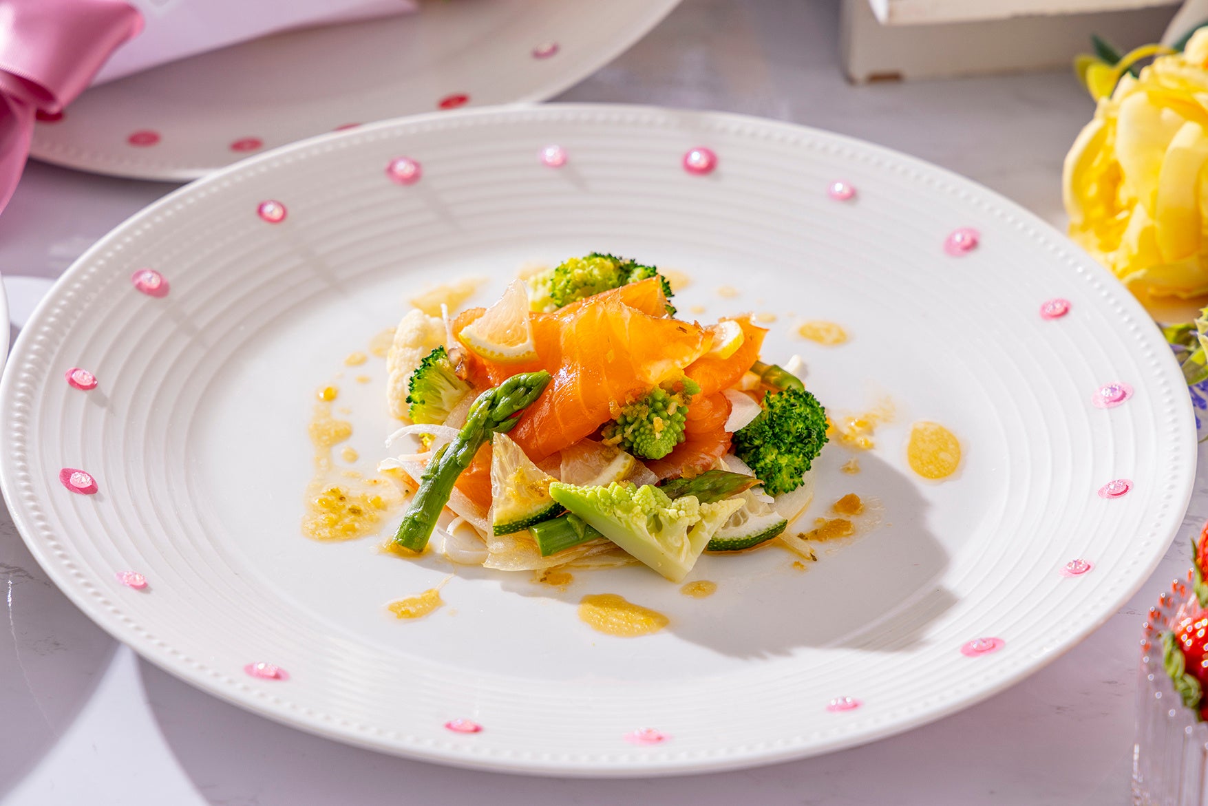 イチゴと小柱、野菜のサラダ 青のりのジュレ/新玉ねぎのブリュレ/スモークサーモンと春野菜 ヴィネグレット プランタニエール/春キャベツのフランと桜香るフェッテ・サレ/ホタテ貝 春の香りの蕗の薹、オリーブ、粒マスタード/サラダバー(ドレッシング/コンディメント各種)/フレッシュフルーツ盛合せ/ホールチーズのスペシャルシーザー(平日ディナー)