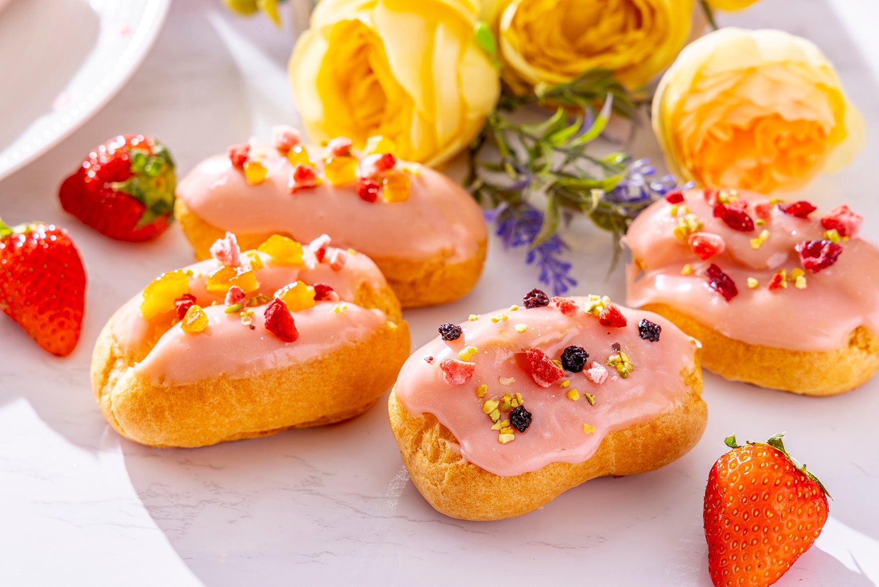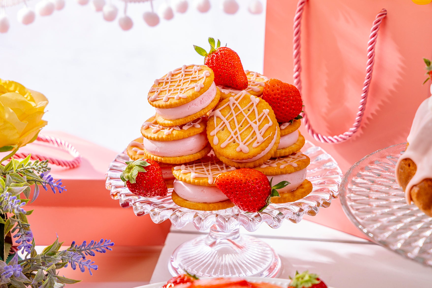 ストロベリーギモーヴサンド/ストロベリーエクレア/ストロベリーマトラッセケーキ/ベリークグロフ/いちごとさくら餡のクレープ/ベリードームショコラ/ストロベリーキューブショートケーキ/ストロベリーシフォンケーキ/ストロベリーパンナコッタ/ストロベリーゼリー/ストロベリーシナモンクランブルなど