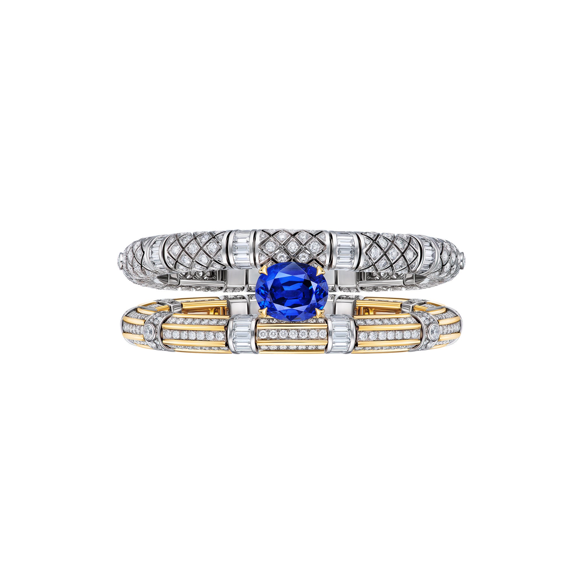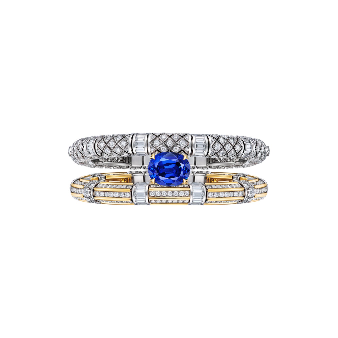 また、メゾンのハイジュエリー コレクション「ディープ タイム」より、プラチナとホワイトゴールドに10.57カラットのオーバルカットサファイアとダイヤモンドをセットしたブレスレット「フォッシル」、ハイジュエリー コレクション「イディール」より、ダイヤモンドとホワイトゴールドのイヤリング、ハイジュエリー コレクション「ブレイヴァリ―」より、ダイヤモンドとホワイトゴールドに3.01カラットのLV モノグラムスターカットダイヤモンドがセットされたリング「ラ・スタール・デュ・ノール」も着用しました。