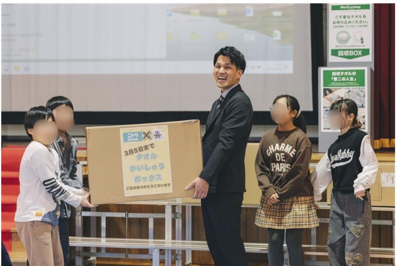 当日、「タオルを134枚集めました。想いがこもっているから重さは100kgです。タオルの第二の人生をよろしくお願いします!」という児童の言葉とともに、段ボール箱2箱分のタオルをニトリへ届けてくれました。