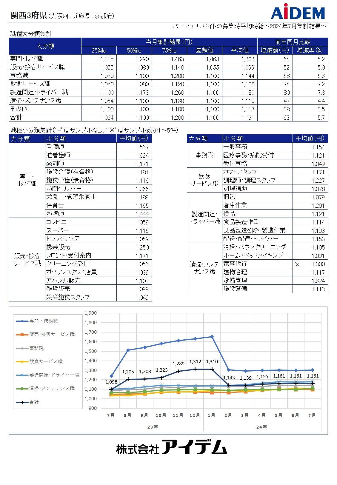 職種大分類別の平均時給は、「専門・技術職」1,303円(前年同月比64円増)、「製造関連・ドライバー職」1,180円(同80円増)、「事務職」1,144円(同58円増)、「清掃・メンテナンス職」1,110円(同47円増)、「飲食サービス職」1,106円(同74円増)、「販売・接客サービス職」1,099円(同52円増)の順で、前年同月比で全ての職種がプラスとなった。府県別の平均時給は、大阪府1,193円(前年同月比56円増)、兵庫県1,129円(同75円増)、京都府1,104円(同31円増)の順となり、前年同月比で全ての府県がプラスとなった。