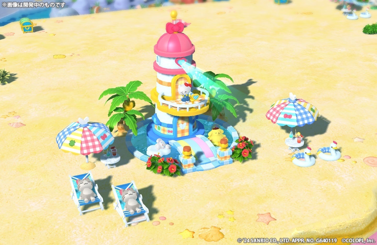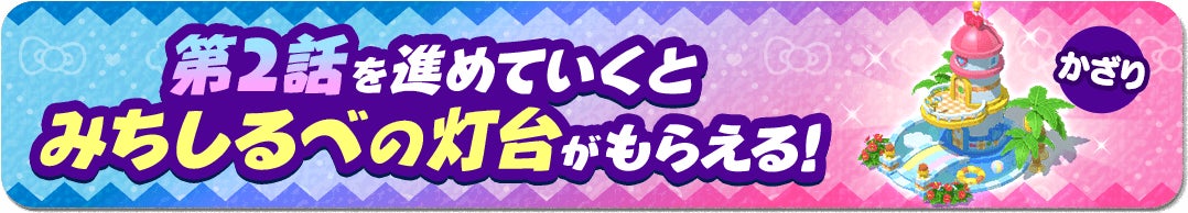 「第2話」をさらに進めると手に入る「みちしるべの灯台」を島に置くと、「ハローキティ」「シナモロール」「ポムポムプリン」が特別な動きで遊ぶ様子を楽しむことができます。
