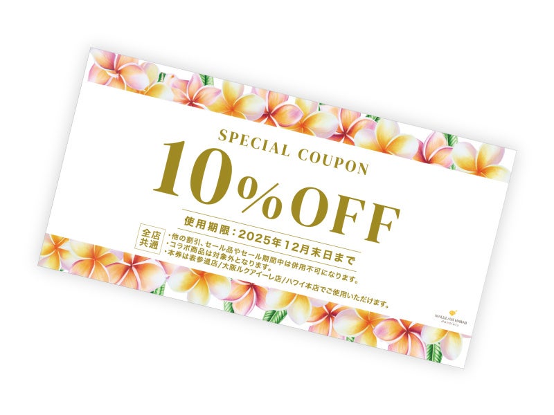 表参道・大阪・ハワイで使える♪「10%OFFクーポン」ハワイ発「マルラニハワイ」直営店にて配布中!