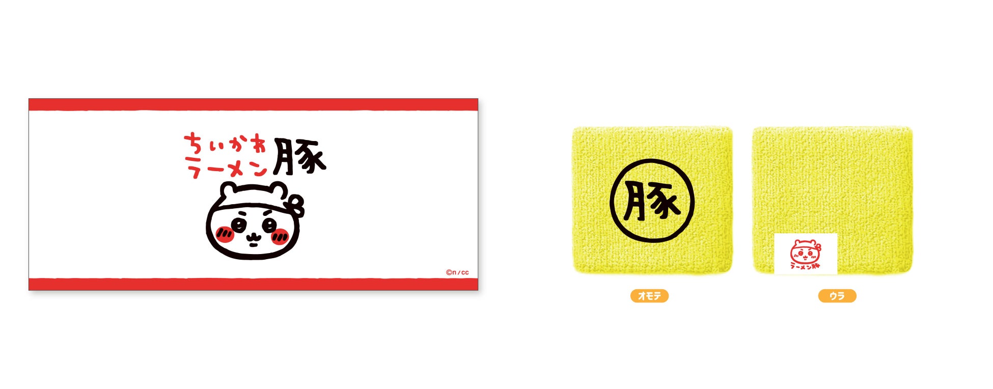 「ちいかわラーメン 豚」のオリジナルグッズは、公式ECショップ「ちいかわマーケット」でも販売予定でございます。またオリジナルボトルの黒烏龍茶は、名古屋PARCO館内に自動販売機を設置し販売を予定しております。