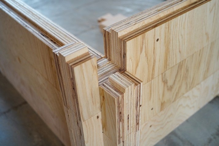 今回の「ウッドデザイン賞2023」を受賞した「ITaLOG」は、合板をCNCルーターで加工し、組み合わせることでログ材を構成して小屋を建てるログ構法です。小さなパーツに分割できるため、自家用車での運搬や、手作業での組み立てが可能になりました。共有されたデジタル加工データをCNCルーターで加工することで、運搬のコストや環境負荷の低減に貢献します。
